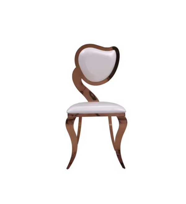 This uniquely designed chair features a sculptural heart-shaped backrest, giving it an artistic and romantic appeal. The frame is made of polished metal with a warm rose gold or bronze finish, adding a contemporary yet classic touch. The curved legs enhance its elegance, while the plush white seat and backrest provide comfort and style. The combination of smooth metallic elements with soft upholstery makes it perfect for high-end interiors, dining areas, or boutique settings.