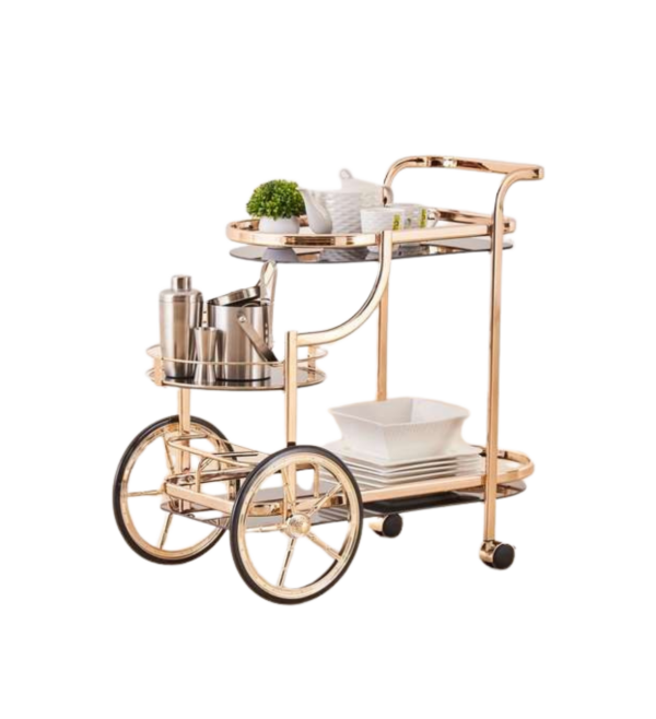 A Luxury Rolling Bar Cart with Gold Finish Trolley is an elegant and functional piece of furniture designed to elevate the style of any living room, dining area, or entertaining space. Combining sophistication with convenience, it’s perfect for hosting guests and displaying barware in a luxurious manner. Here’s a detailed description of this stylish trolley: