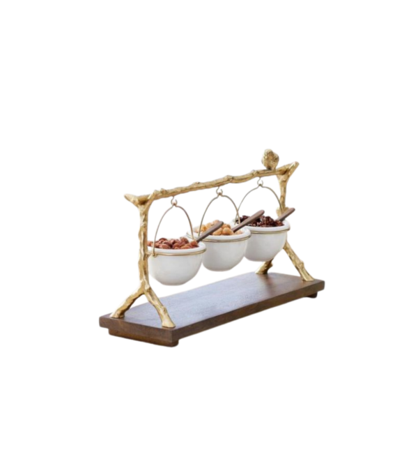 A Snacks Bowl Golden Buffet Display features an array of luxurious bowls or trays, each holding different snacks, arranged in a sophisticated and inviting manner. The golden accents on the bowls or trays create an elegant, festive vibe, perfect for a lavish buffet spread. The bowls may vary in size, allowing for a mix of different snacks, such as crunchy chips, savory nuts, bite-sized appetizers, or even candy and chocolates.