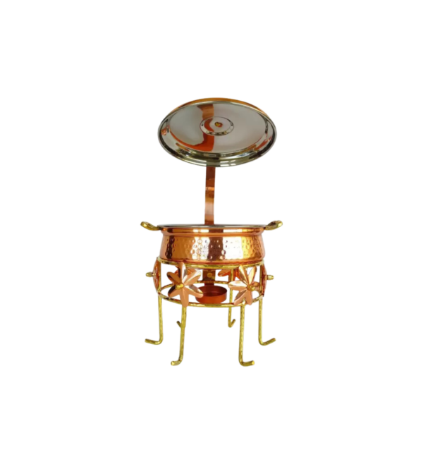 - The handles and legs of the chafing dish are typically crafted from copper, providing a complementary contrast to the steel body. Some designs may also feature intricate copper detailing for a more luxurious touch, making the chafing dish a centerpiece on any serving table.